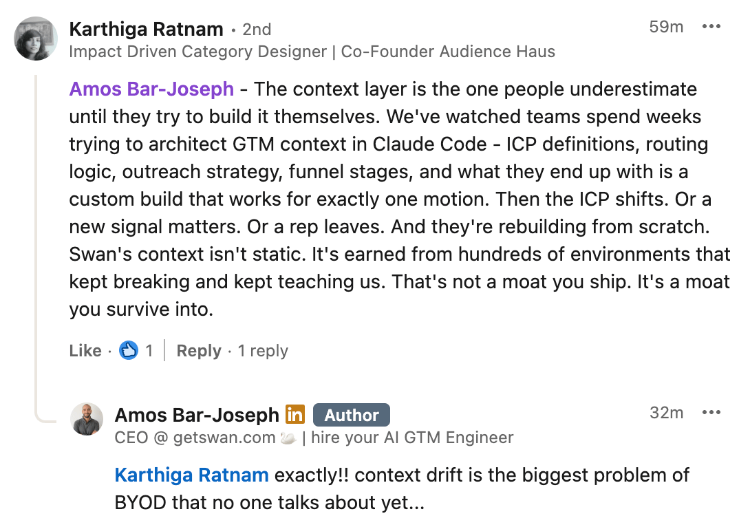 What components, what structure, how to maintain it as your GTM evolves. We already did that work. Hundreds of customers, battle-tested across real GTM environments. When you work with Swan, you're not getting a blank canvas. You're getting a system that already knows what GTM context looks like because we spent a year learning it the hard way.